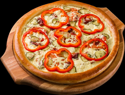 Фирменный соус, бекон, колбаски охотничьи, помидоры, перец болгарский, маринованные огурцы, сыр гауда.