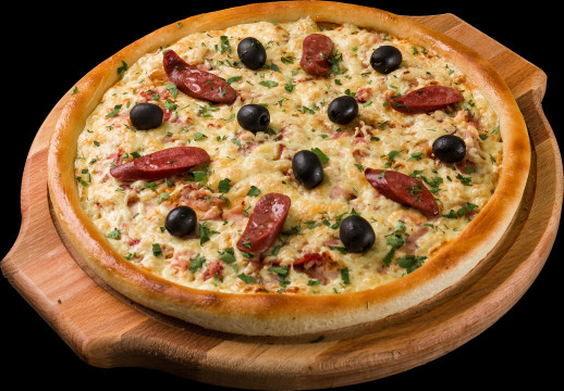 Фирменный соус, ветчина, колбаски охотничьи, маринованные огурцы, сыр гауда, оливки, зелень.