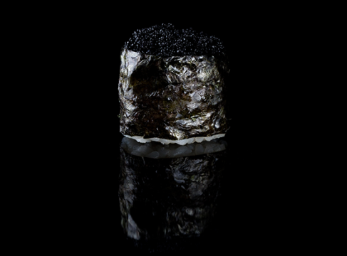 Суши гункан, заполненные чёрной икрой тобико - летучей рыбы. Очень вкусно!
