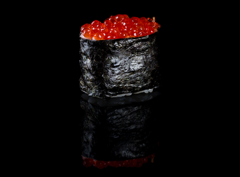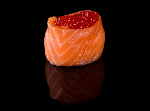 Суши гункан с зернистой икрой лосося, обёрнутый ломтиком нежного норвежского лосося. Роскошно и вкусно!