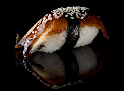 Суши нигири с подкопчёным угрём, приправленным соусом унаги и зёрнышками светлого слегка обжаренного кунжута.