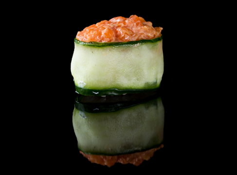 Рулетики с копченым лососем, сливочным сыром и огурчиком.