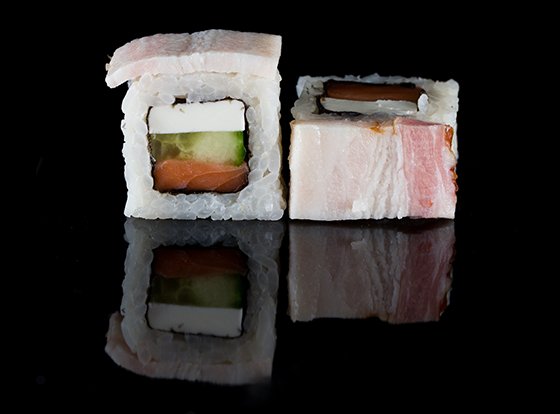 Изящный ролл со свежим норвежским лососем, сливочным сыром, огурчиком и сырокопченым беконом.