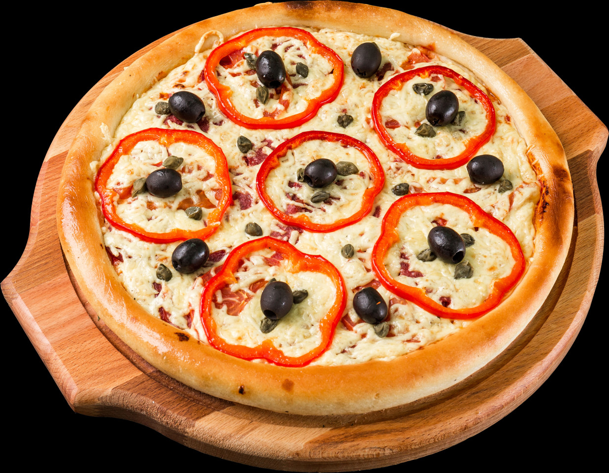 Томатный соус, пепперони, сервелат, болгарский перец, помидоры, сыр гауда, оливки, каперсы, зелень.