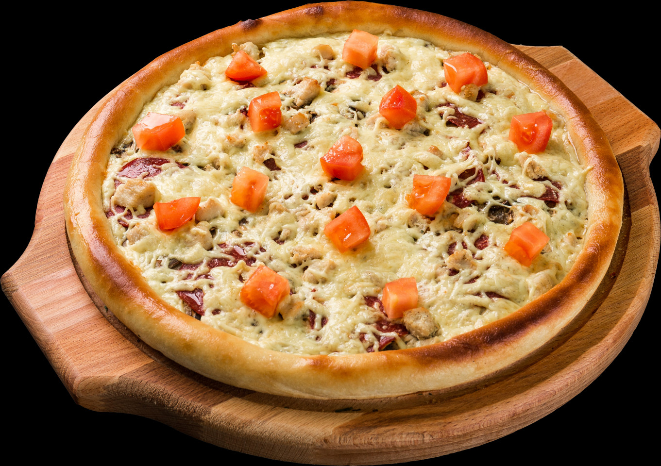 Фирменный соус, сервелат, куриное филе, шампиньоны, помидоры, сыр гауда.