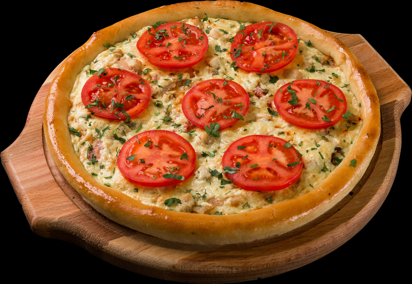 Фирменный соус, бекон, куриное филе, помидоры, сыр гауда, зелень.