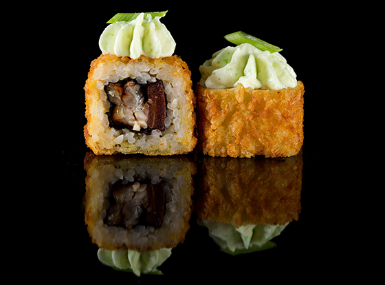 Жареный ролл с угрем, помидором, зеленым луком и соусом "Лава".