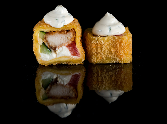 Жареный ролл с куриным филе, огурцом, помидором, сливочным сыром и чесночным соусом.
