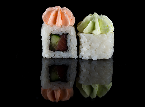Ролл с копченым лососем, огурцом и соусом "Лава".