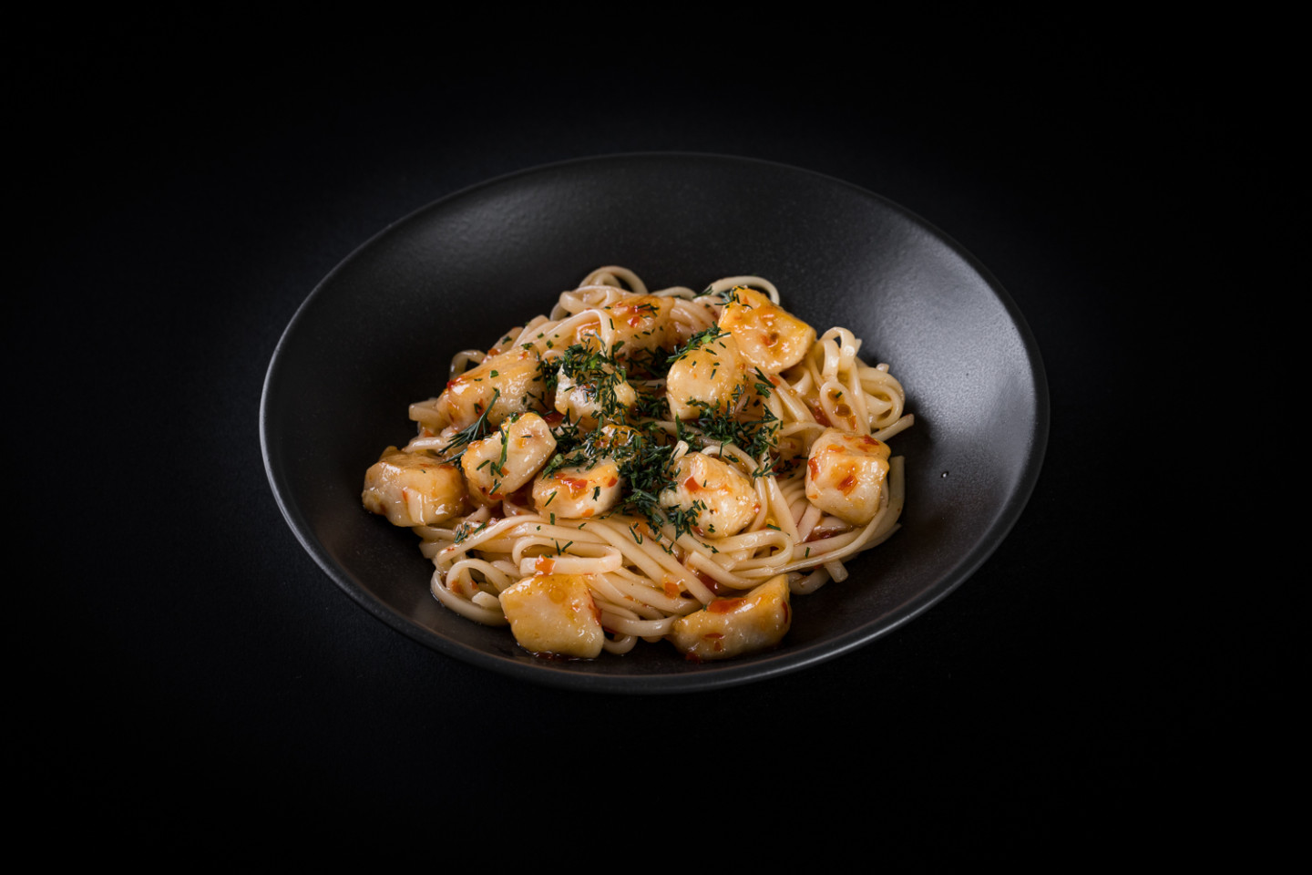 Лапша удон пшеничная, курица филе, соус кисло-сладкий, уксус бальзамический, лук зеленый, кунжут белый и черный.