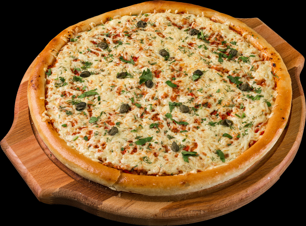 Томатный соус, фарш свиной, болгарский перец, лук репчатый, сыр гауда, каперсы, зелень.