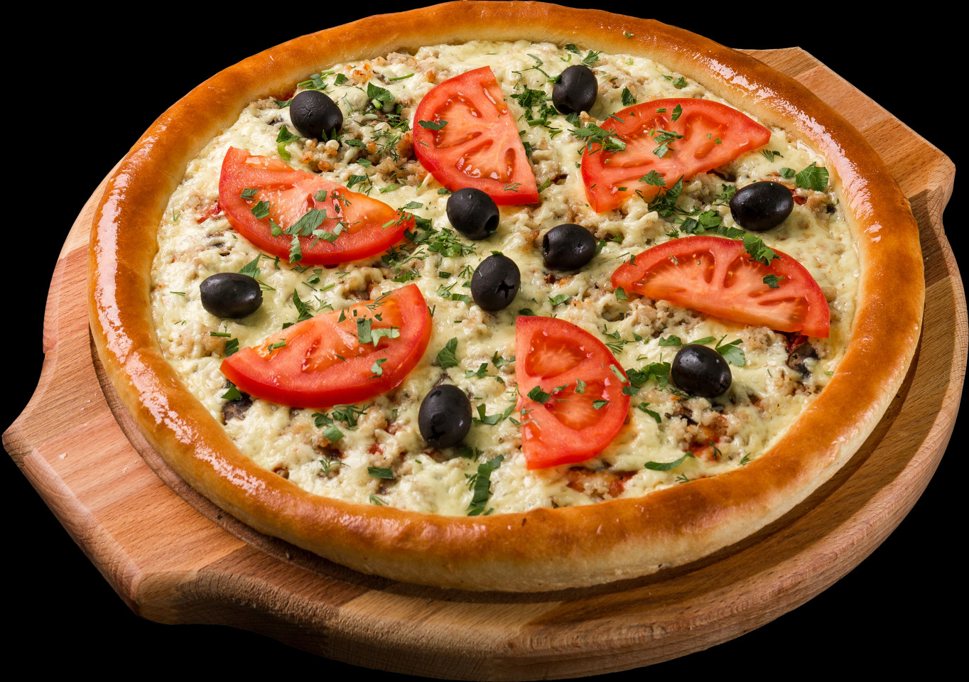 Томатный соус, фарш свиной, шампиньоны, помидоры, сыр гауда, оливки, зелень.
