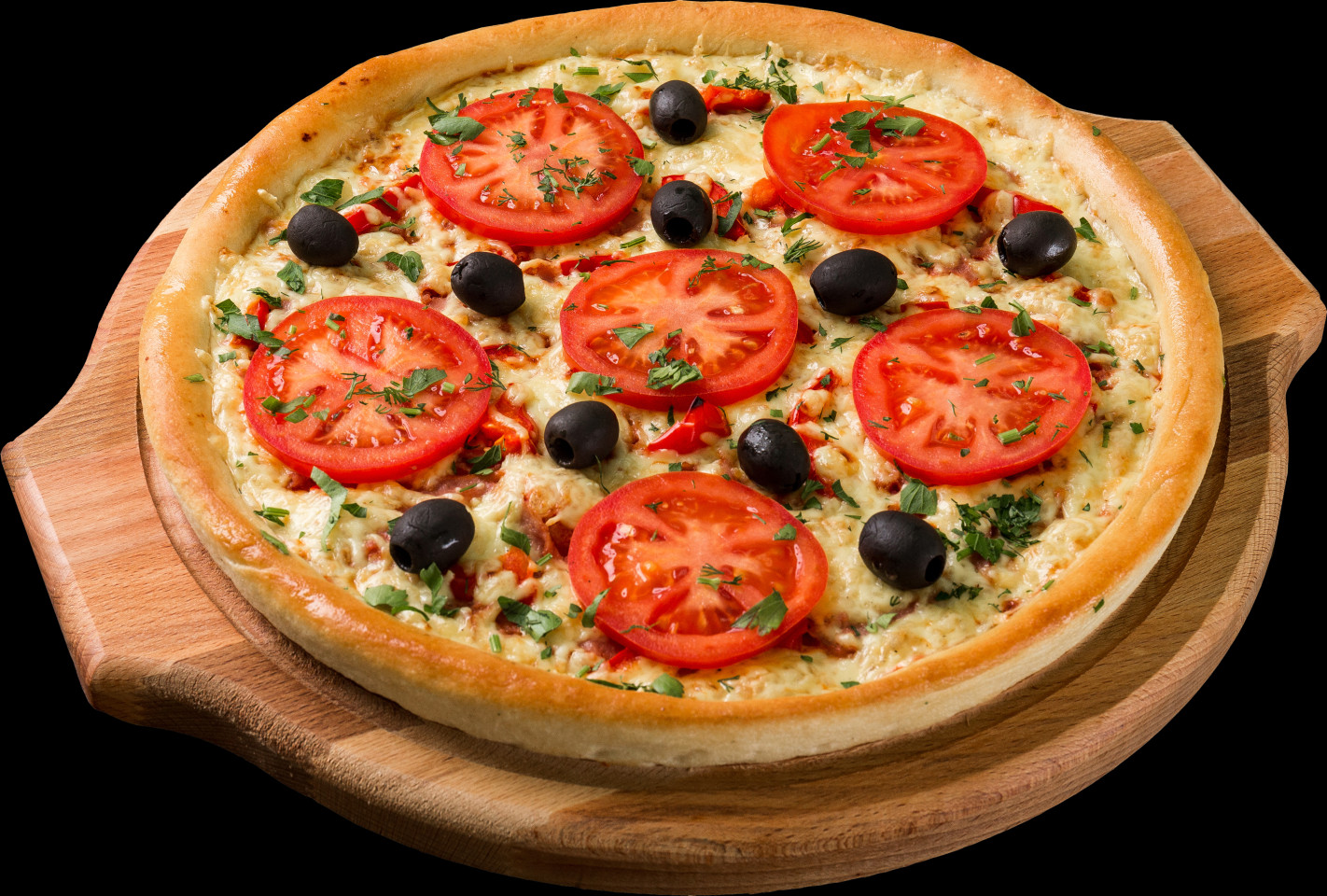 Томатный соус, ветчина, помидоры, болгарский перец, сыр гауда, оливки, зелень.
