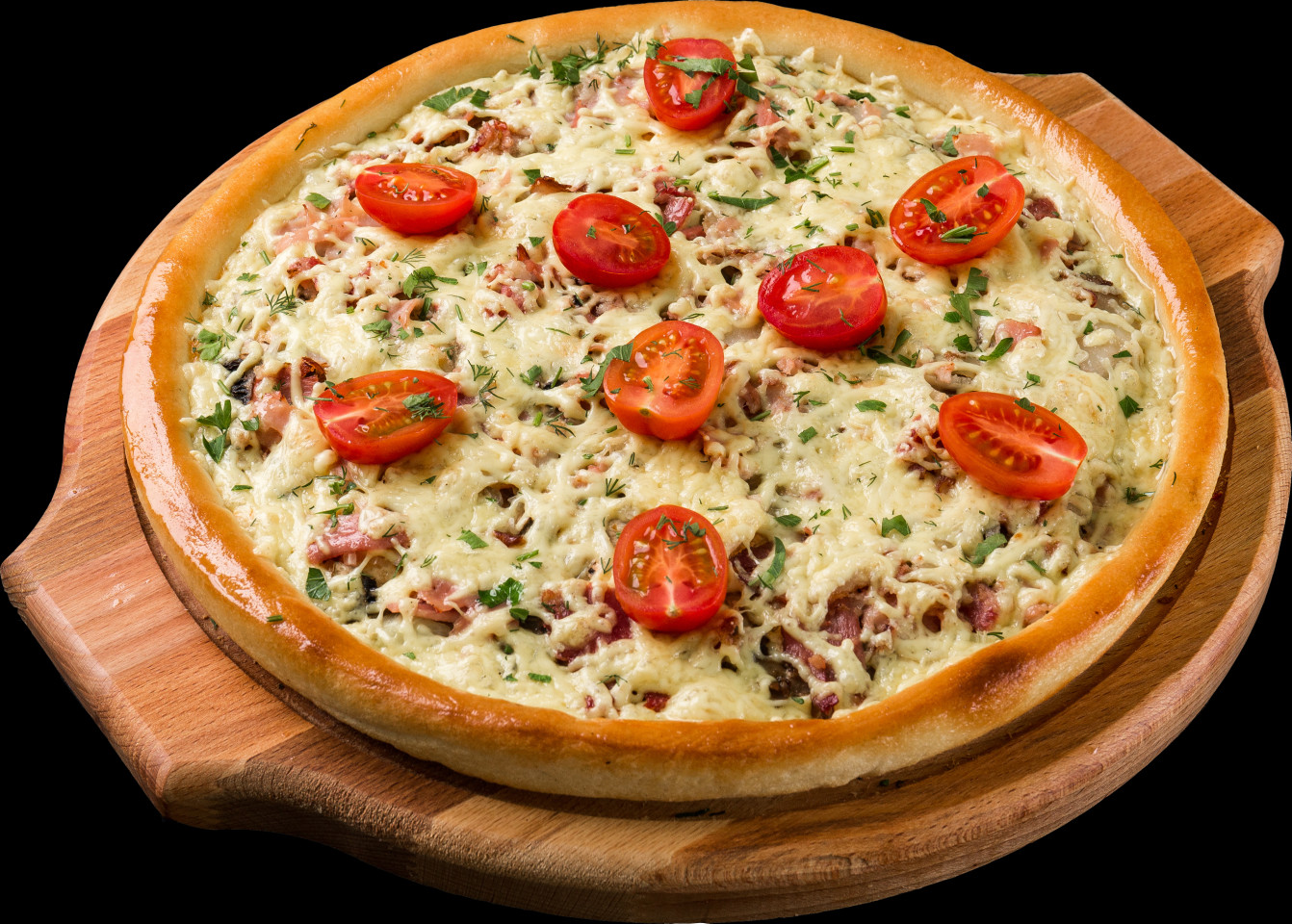 Фирменный соус, бекон, копченое мясо, шампиньоны, репчатый лук, помидоры черри, сыр гауда, зелень.