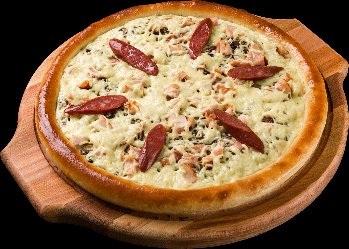 Чесночный соус, буженина, филе копченой курицы, колбаски охотничьи, шампиньоны, сыр гауда.