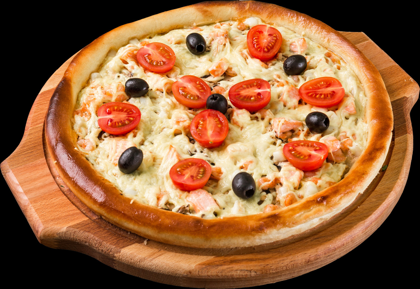 Фирменный соус, тигровые креветки, слабосоленая семга, краб, шампиньоны, помидоры черри, сыр гауда, оливки, лимон.